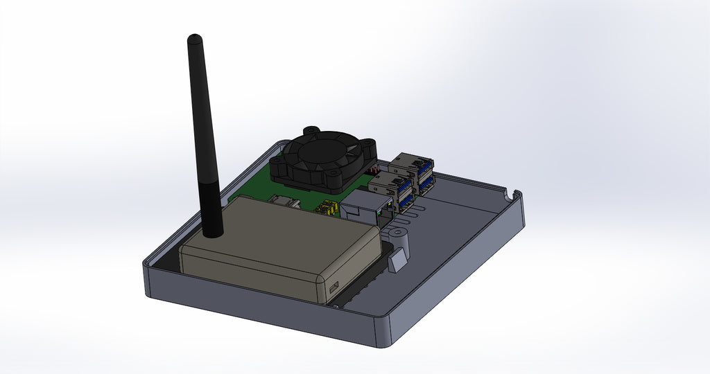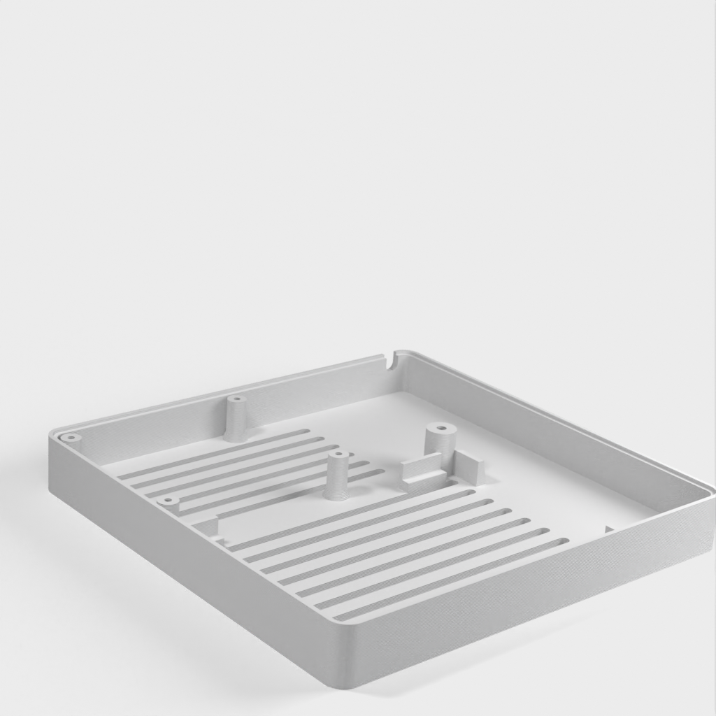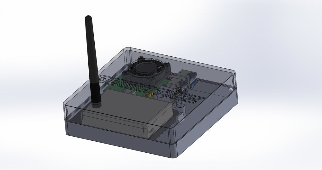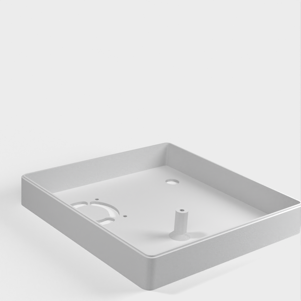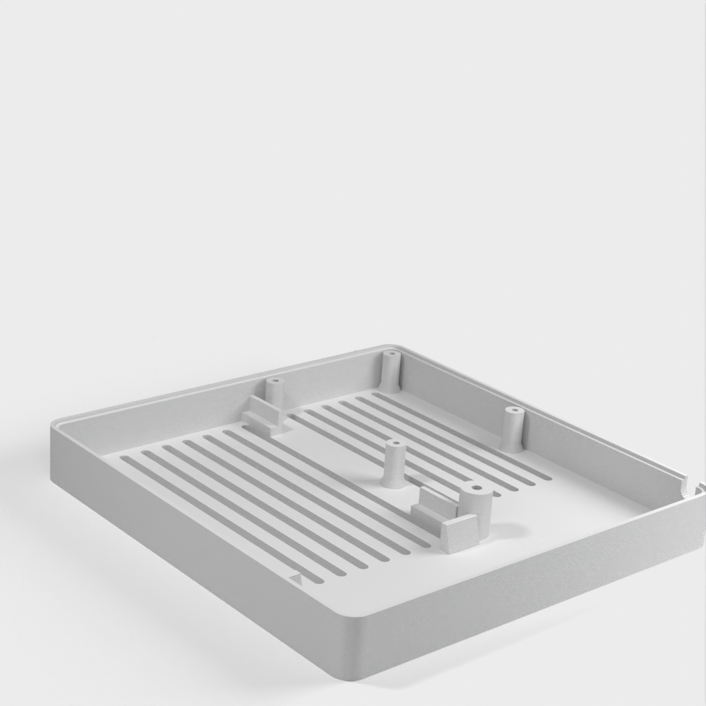 Personlig kasse til Domoticz, der indeholder Raspberry Pi, Pi Drive, RFX.com, Aeon stick z wave. En 40 mm ventilator skal monteres på topdækslet. Husk at tilføje puder under kassen for at sikre optimal køling. Der er foretaget ændringer i henhold til tekniske tegninger, herunder ændring af placeringen af Raspberry's huller og hævning af Raspberry-bordet. En del af topdækslet er blevet gjort tyndere for at tillade visualisering af LED-status gennem transparent materiale.