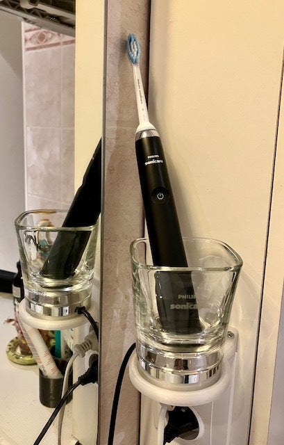This wall mount is designed to efficiently store your Philips Sonicare DiamondClean toothbrush along with its charger. The solution contributes to a more organized bathroom by freeing up valuable countertop space. The mount attaches directly to the wall, ensuring a stable and secure placement for your electric toothbrush. With its design, it holds both the toothbrush and the accompanying glass charger securely in place, making it a practical addition to your existing Philips accessories and an ideal way to keep track of your Philips Sonicare chargers.