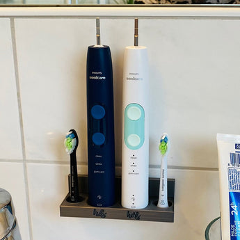 This toothbrush holder is a practical solution for storing two electric Philips Sonicare toothbrushes and their corresponding brush heads. It is developed to create order and free up space in the bathroom by keeping your toothbrushes organized and easily accessible.