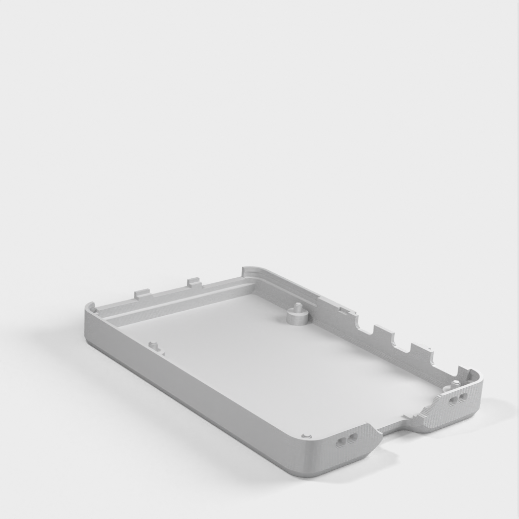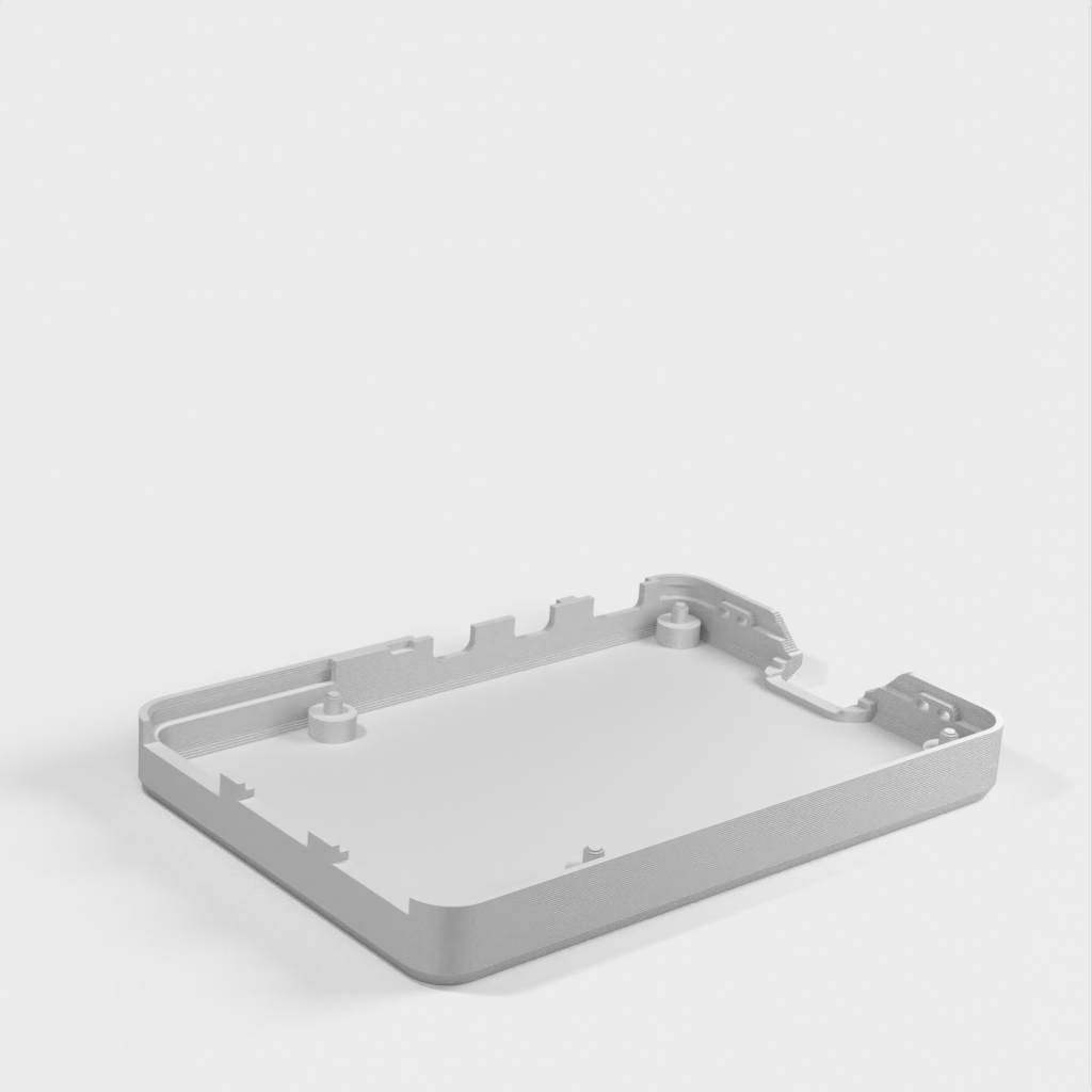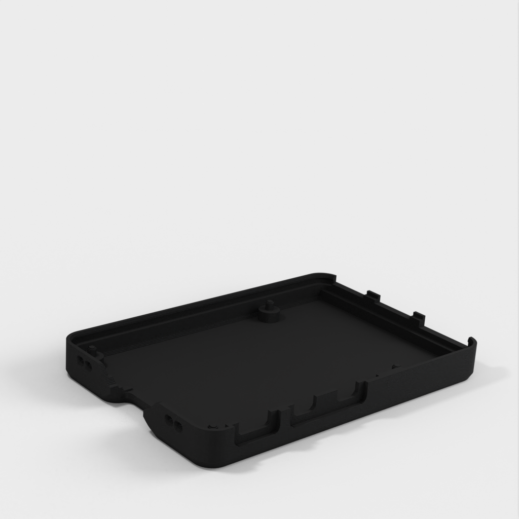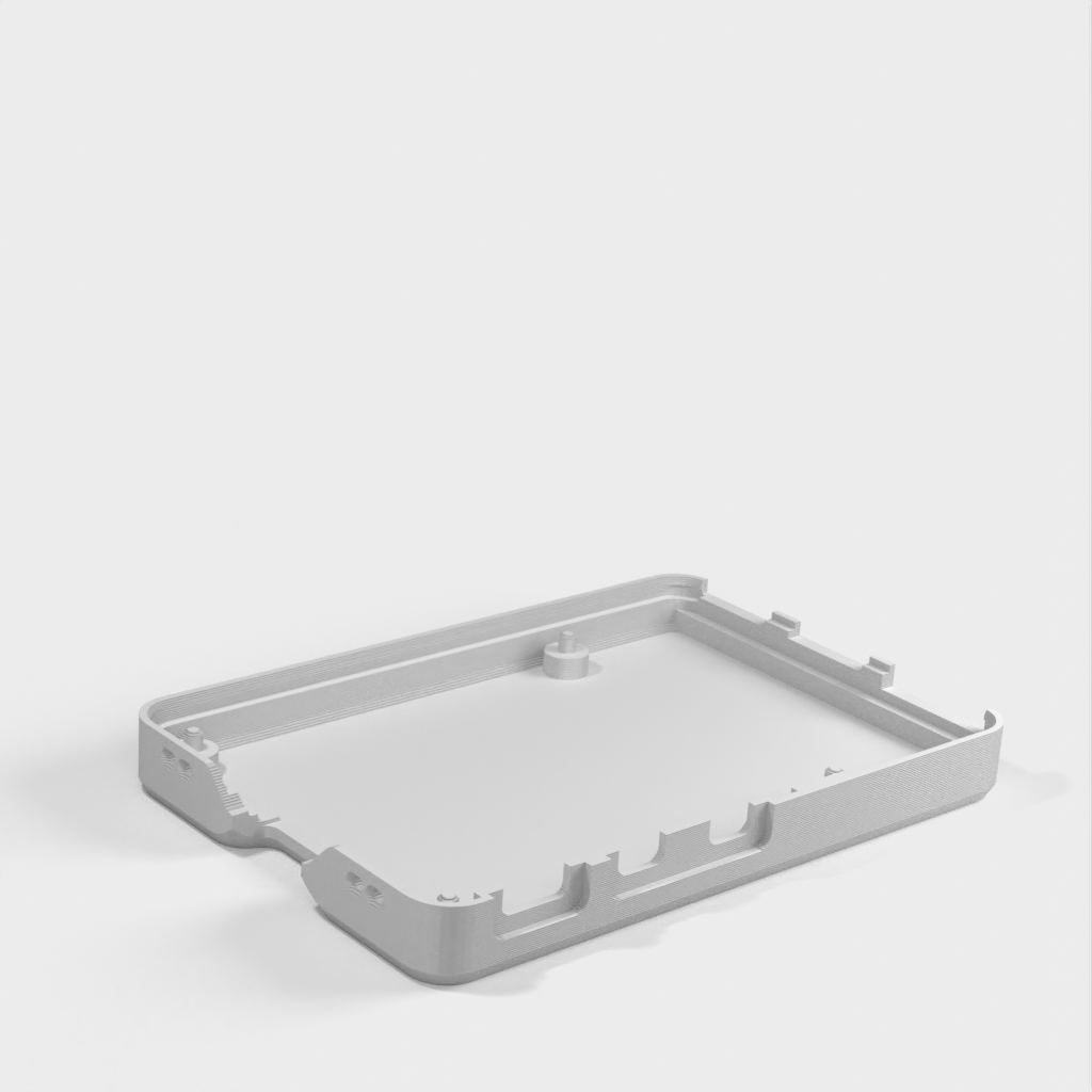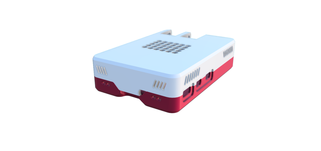 Enkel kabinet til Raspberry Pi 5 fra 2023. Ændringer inkluderer omplacerede USB- og LAN-stik, fjernet hovedtelefonstik og tilføjet en lille åbning for reset-knap. Der er tilføjet ventilationshuller, der passer til den originale køler.