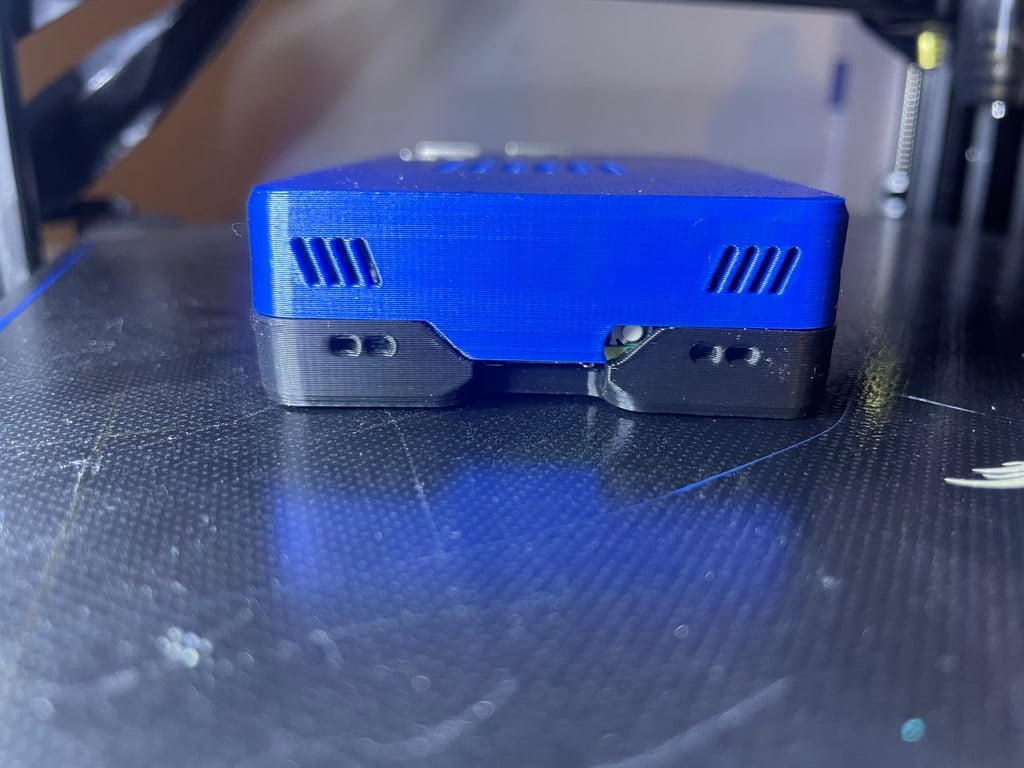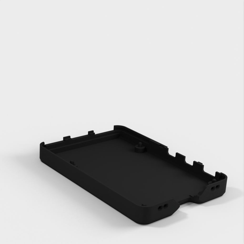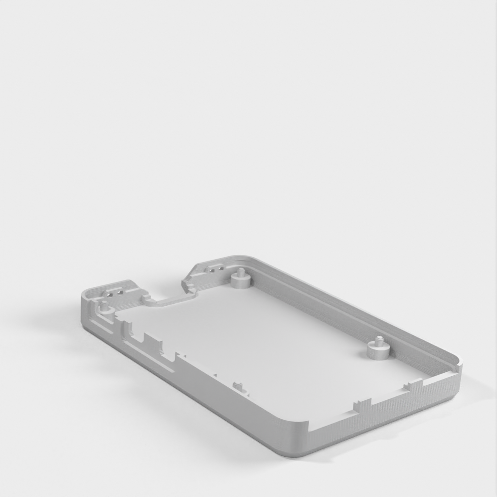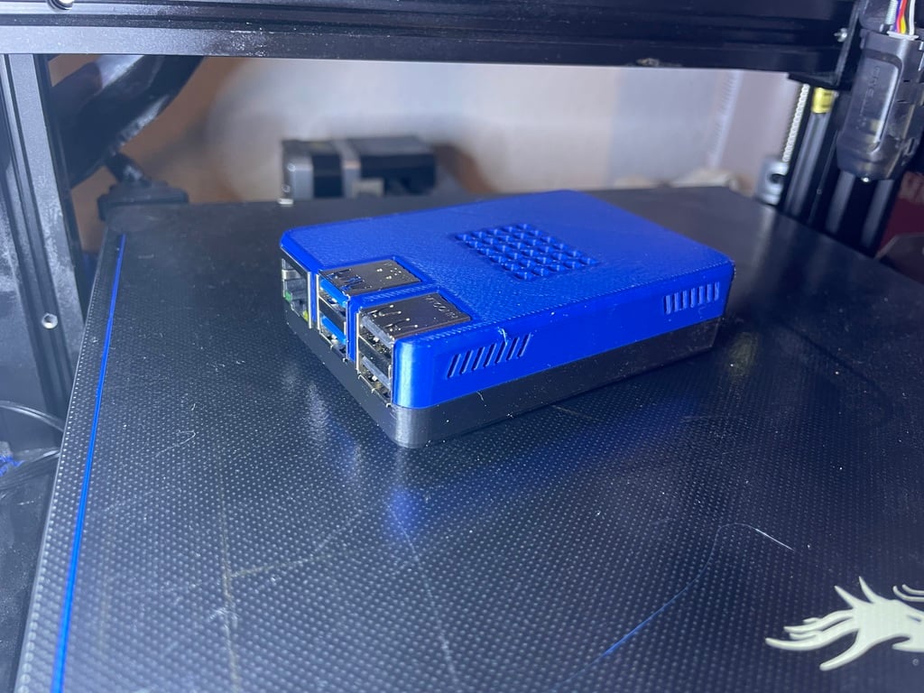 Enkel kabinet til Raspberry Pi 5 fra 2023. Ændringer inkluderer omplacerede USB- og LAN-stik, fjernet hovedtelefonstik og tilføjet en lille åbning for reset-knap. Der er tilføjet ventilationshuller, der passer til den originale køler.