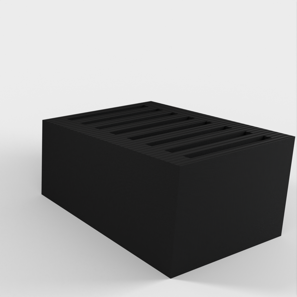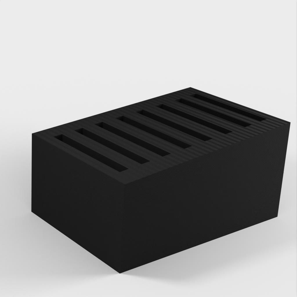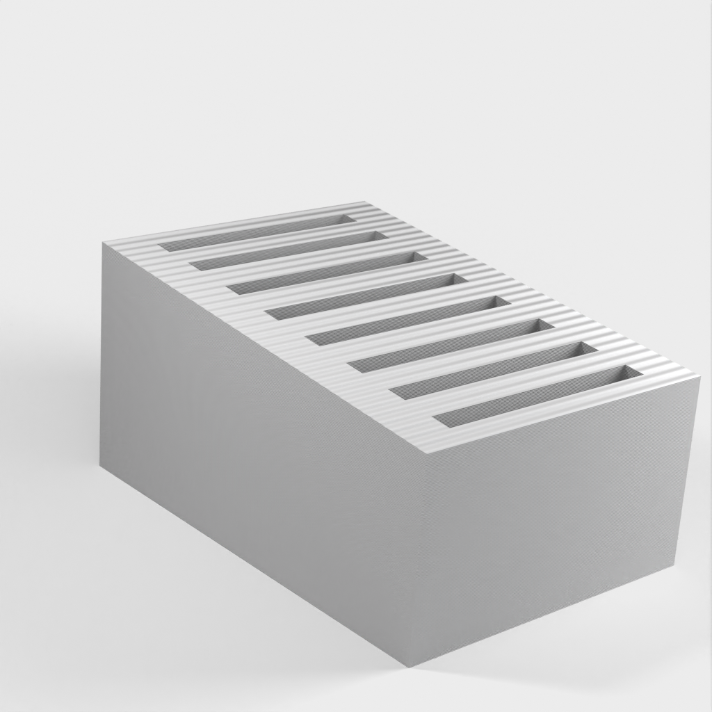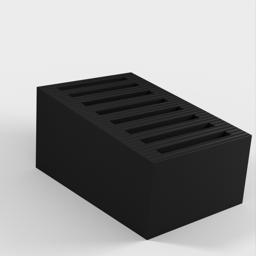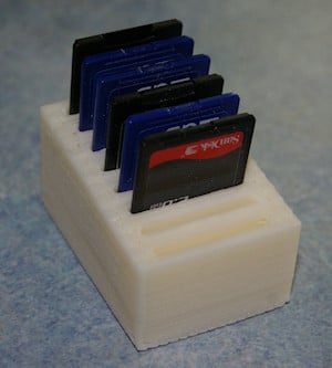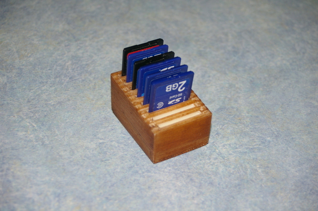 This is a simple SD card holder that can hold up to 8 SD cards. The slots are a bit tight to stop the cards from falling out if you turn the holder upside down. Furthermore, the SD card holder has a very simple design.