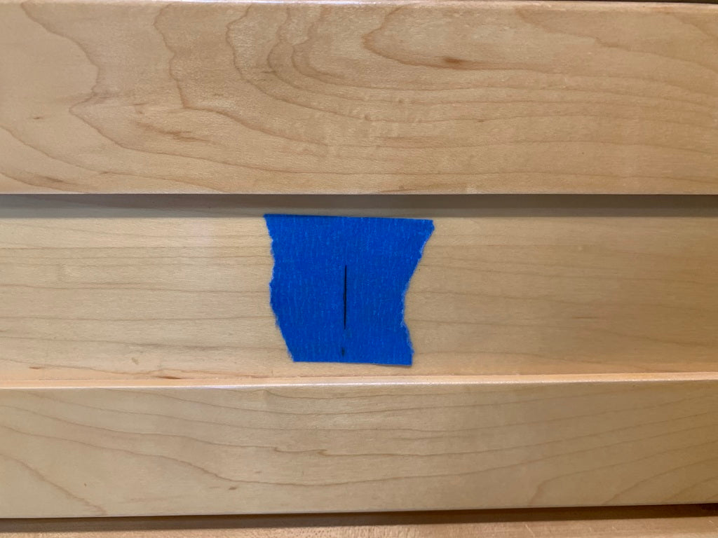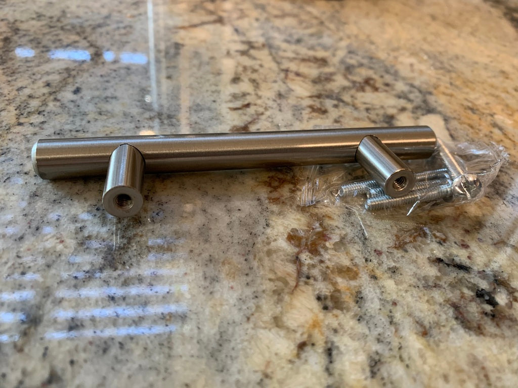 Brugertip: Bor forsigtigt dit første skruehul, og hold skabelonen på plads ved at sætte en skrue gennem skabelonen og ind i hullet. Brug solide håndtag i stedet for hule håndtag for bedre resultater. De solide håndtag jeg brugte er købt fra Amazon.