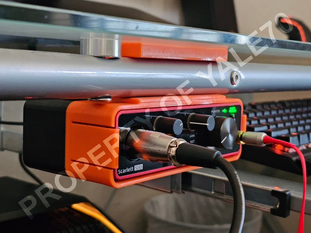 Space-saving mount for Focusrite Scarlett Solo Gen 3 on Realspace Zentra Glass Table