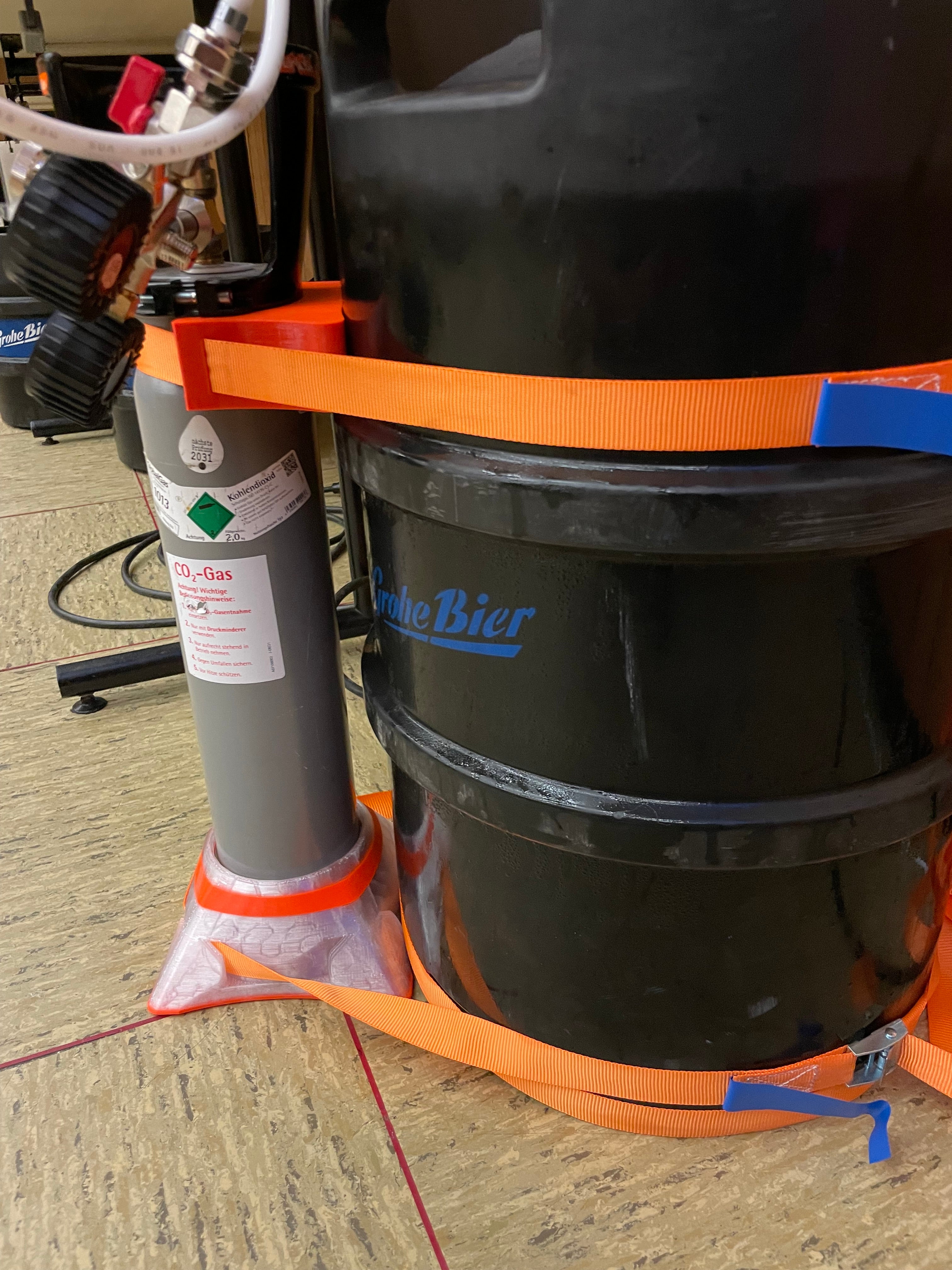 It is specifically developed for 2-litre CO2 cylinders and fits perfectly with both 30-litre and 50-litre beer kegs. With an opening diameter of approximately 10.5 cm, a snug and stable fit is achieved. For added security, the cylinder can easily be fastened with straps up to 25 mm wide, eliminating the risk of tipping over.