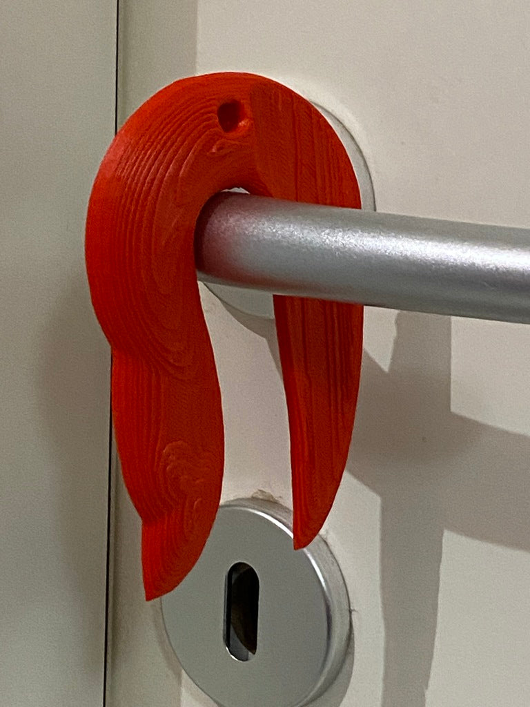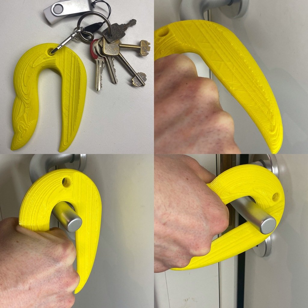 This is the Toucan savegrabber, a key pendant you can use to open doors without touching the handles. It is suitable for both right- and left-handed users. See how it is used in these videos: