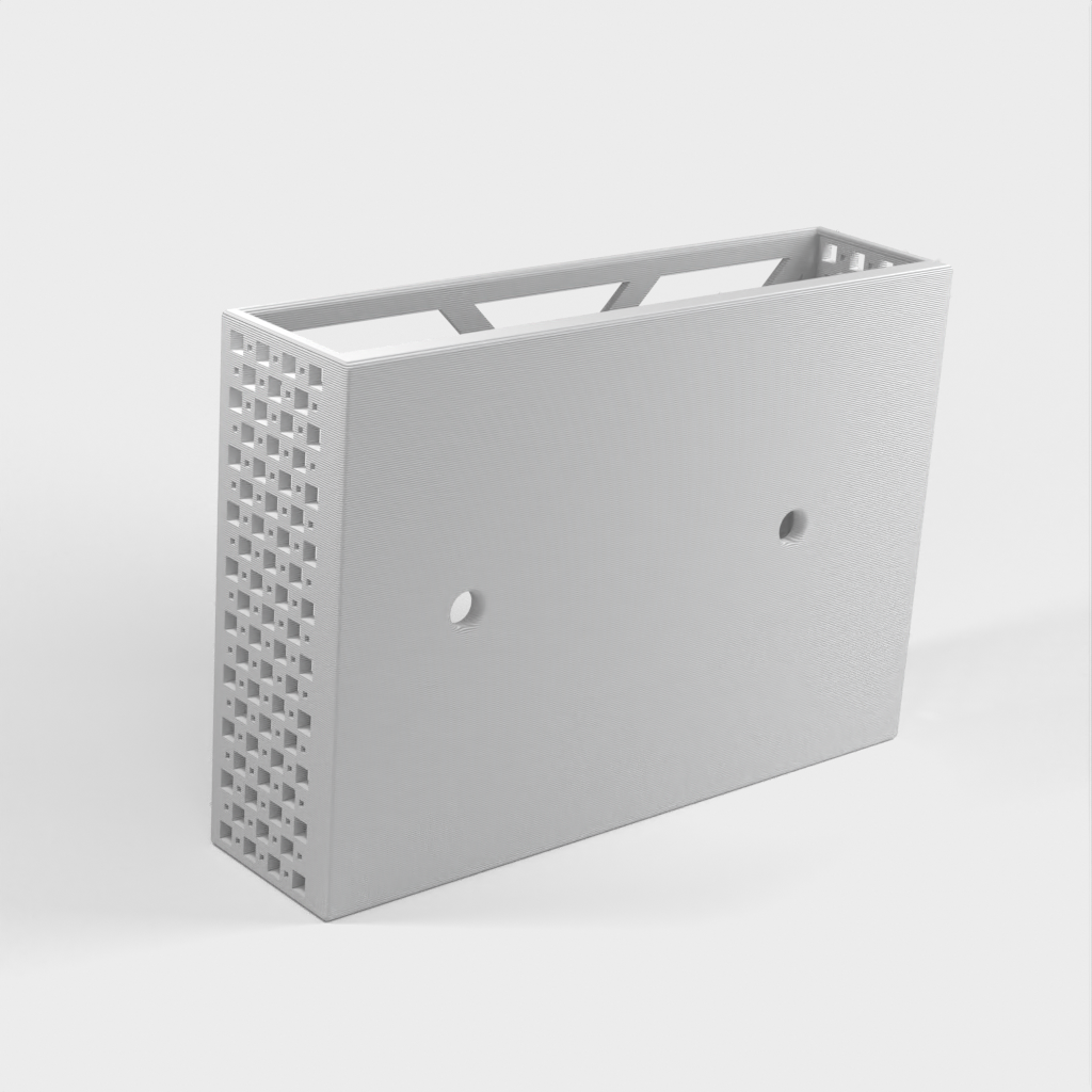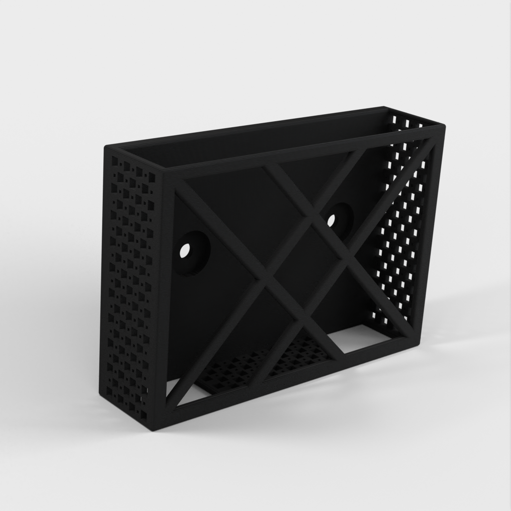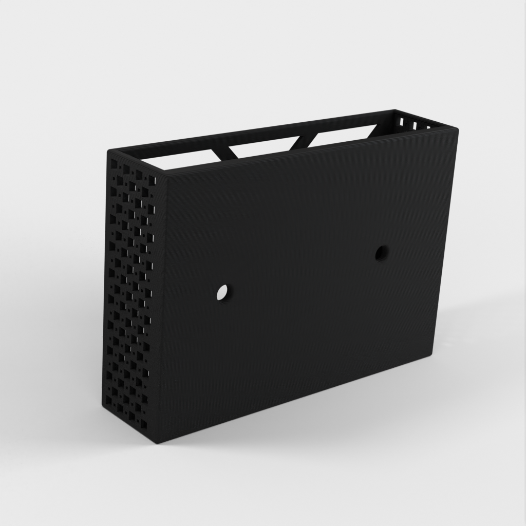 En vægbeslag, der er oprettet specielt til Ubiquiti EdgeRouter X, er designet til at bruge POE på eth0. Hullerne i siderne giver luftcirkulation og forhindrer overophedning. Ekstra knopper er inkluderet for at hjælpe med at holde EdgeRouter X på plads, samt huller på bagsiden for strøm, jord og nulstil adgang. Kanterne er afskåret og fyldt for bedre håndtering og pænere udseende.