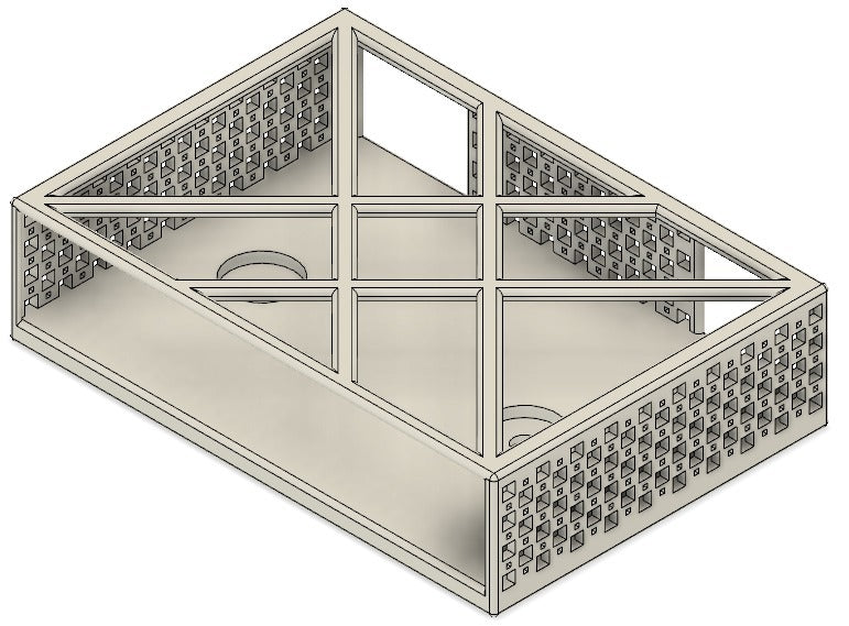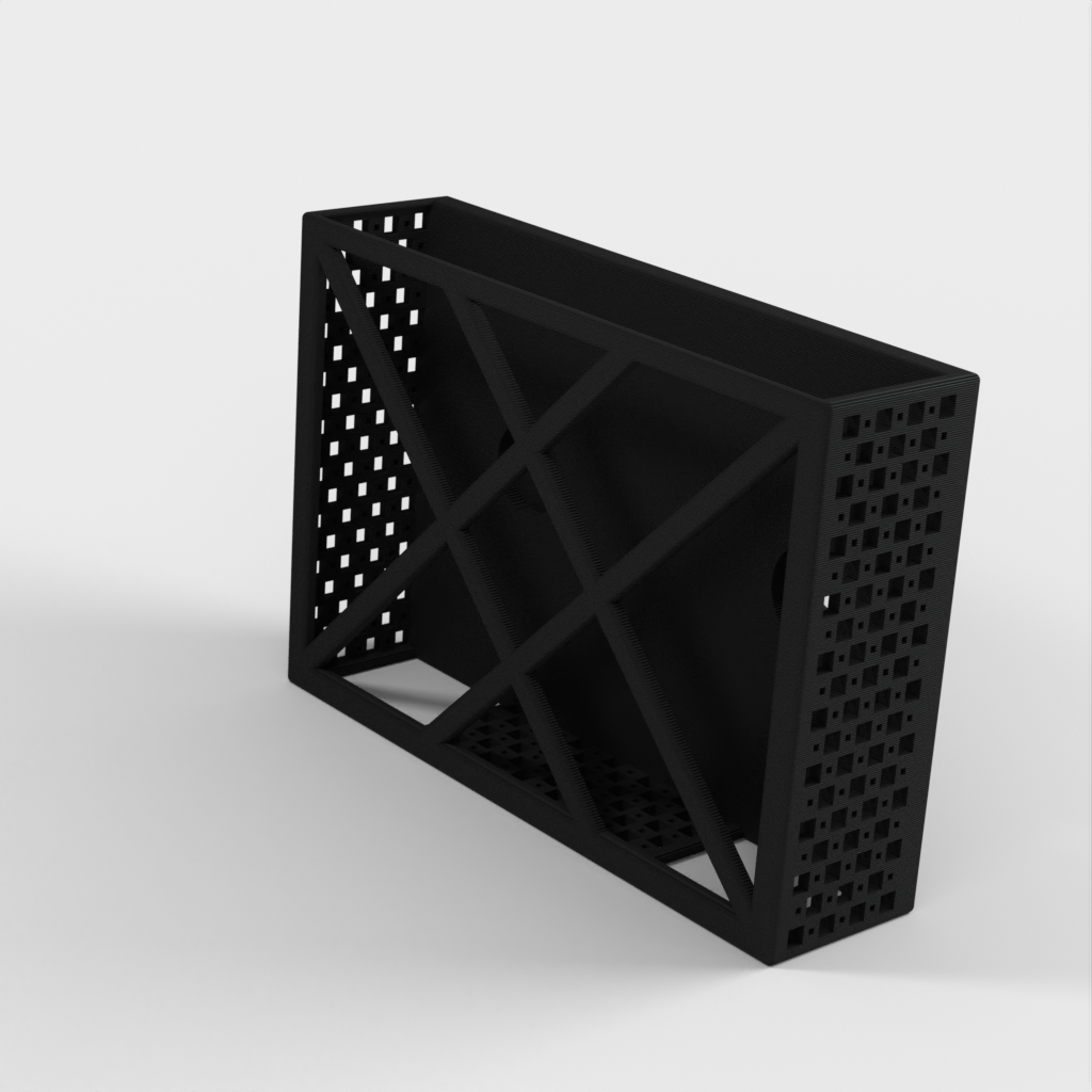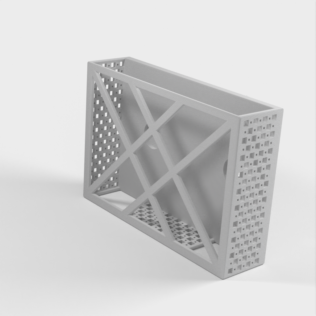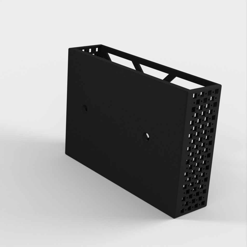 En vægbeslag, der er oprettet specielt til Ubiquiti EdgeRouter X, er designet til at bruge POE på eth0. Hullerne i siderne giver luftcirkulation og forhindrer overophedning. Ekstra knopper er inkluderet for at hjælpe med at holde EdgeRouter X på plads, samt huller på bagsiden for strøm, jord og nulstil adgang. Kanterne er afskåret og fyldt for bedre håndtering og pænere udseende.