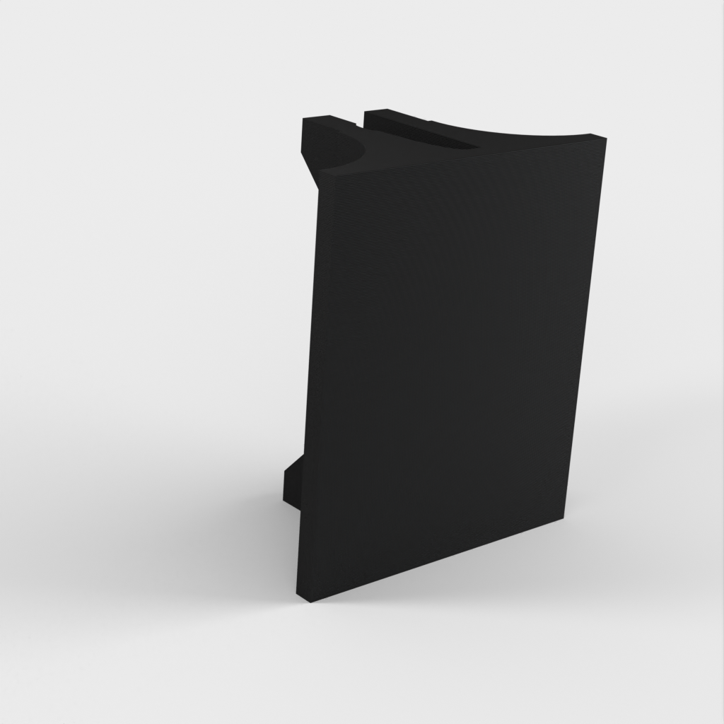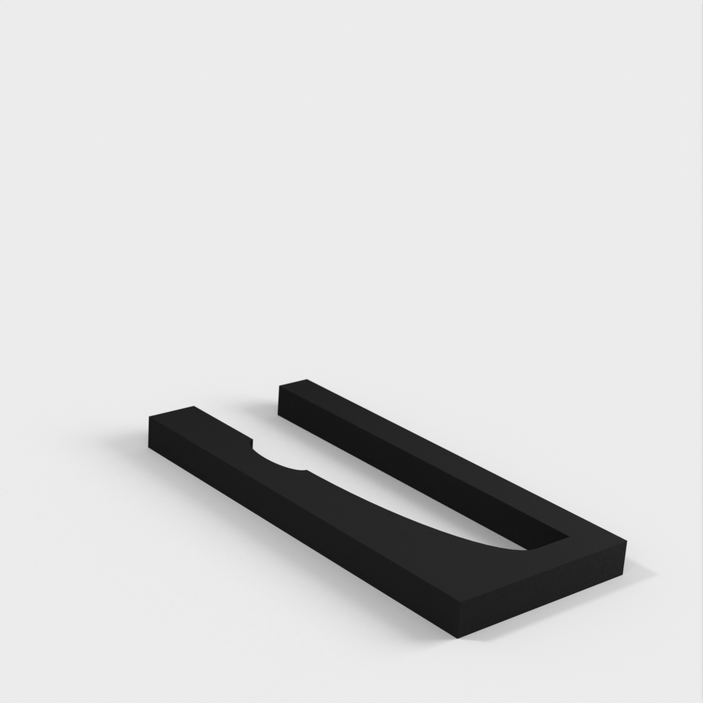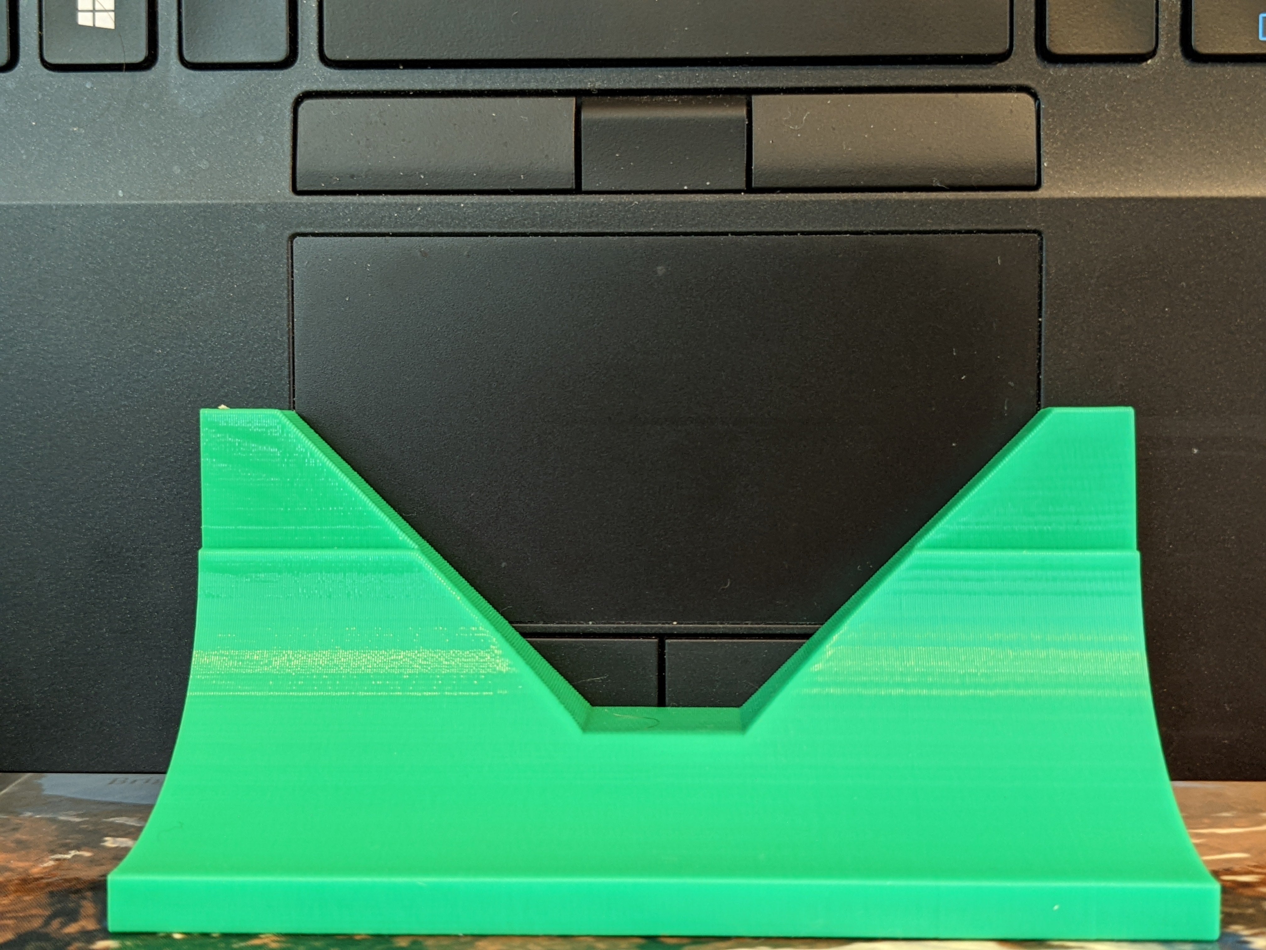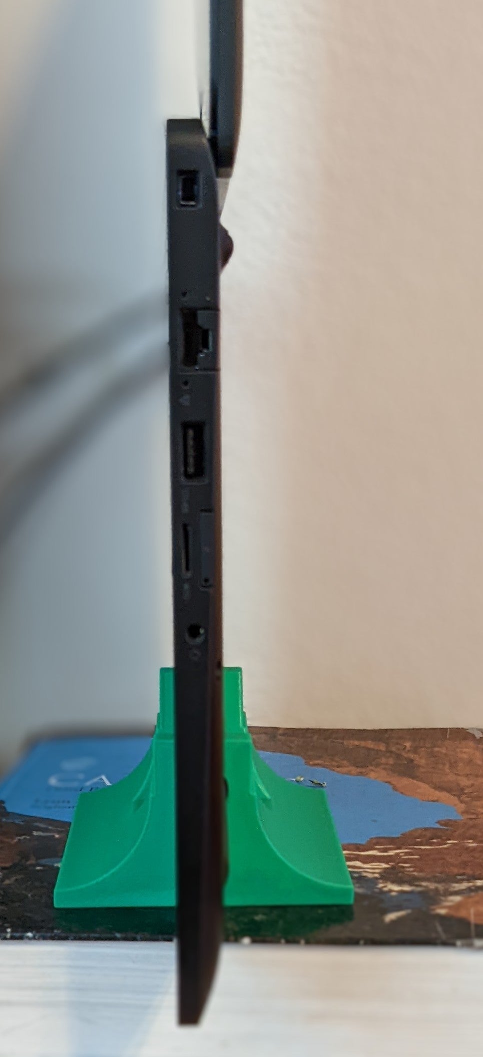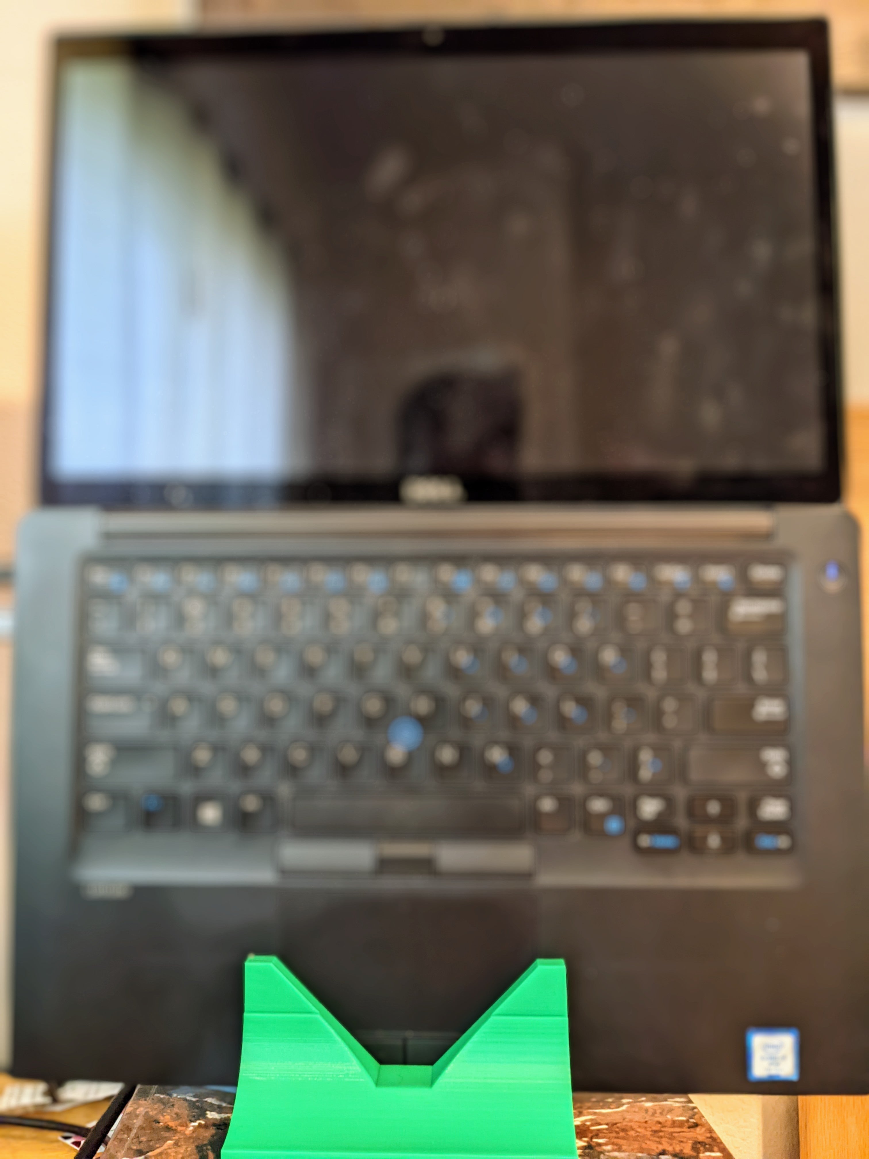 Dette er en laptop stand til at holde Dell Latitude 7480 (~2018) laptop lodret med skærmen åben 180 grader. Standsen sættes på fra bunden eller skubbes på fra siden. Denne placering af skærmen gør det mere ergonomisk at arbejde, når man bruger et eksternt tastatur og mus. Bemærk, at der er en kanal til gummibåndet. Det bør være en perfekt pasform: pæn og tæt uden at være stram. For at fjerne det, skal du skubbe det til begge sider.